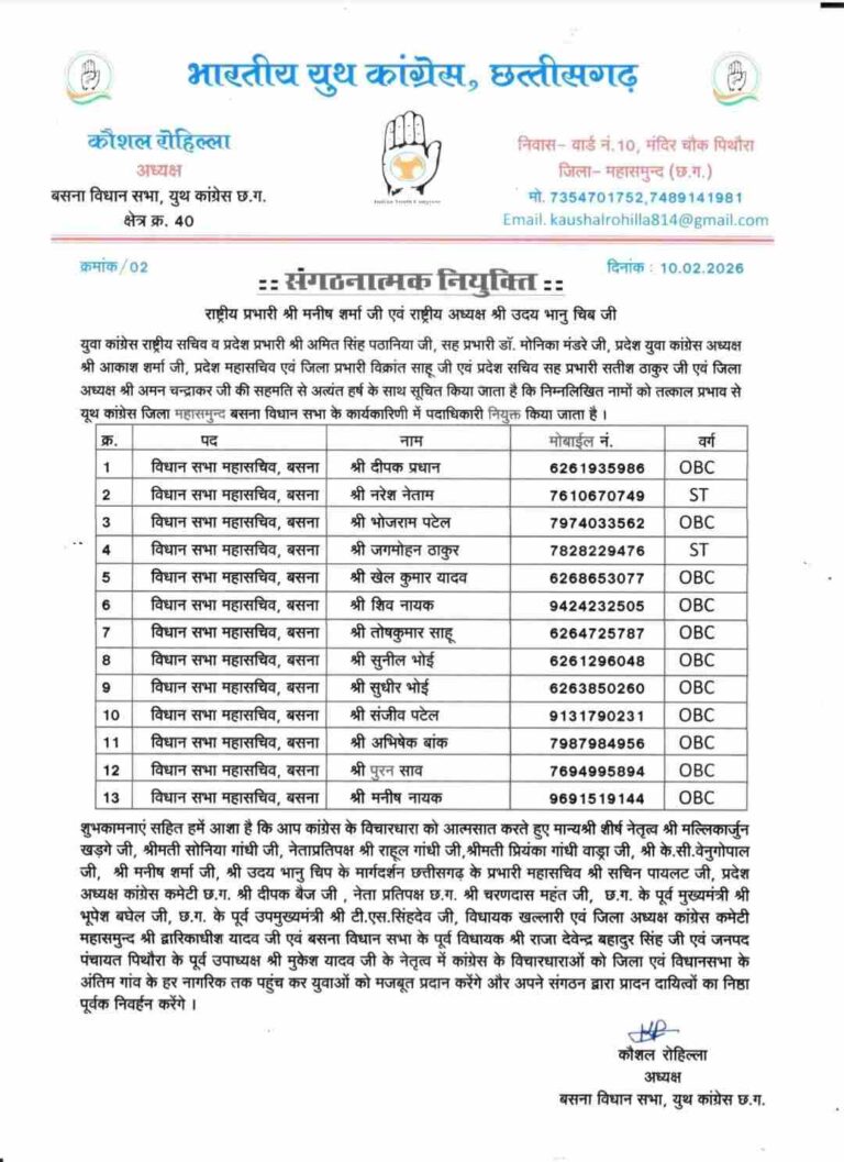 बसना विधानसभा में युवा कांग्रेस का संगठनात्मक विस्तार, कई पदों पर नई नियुक्तियाँ