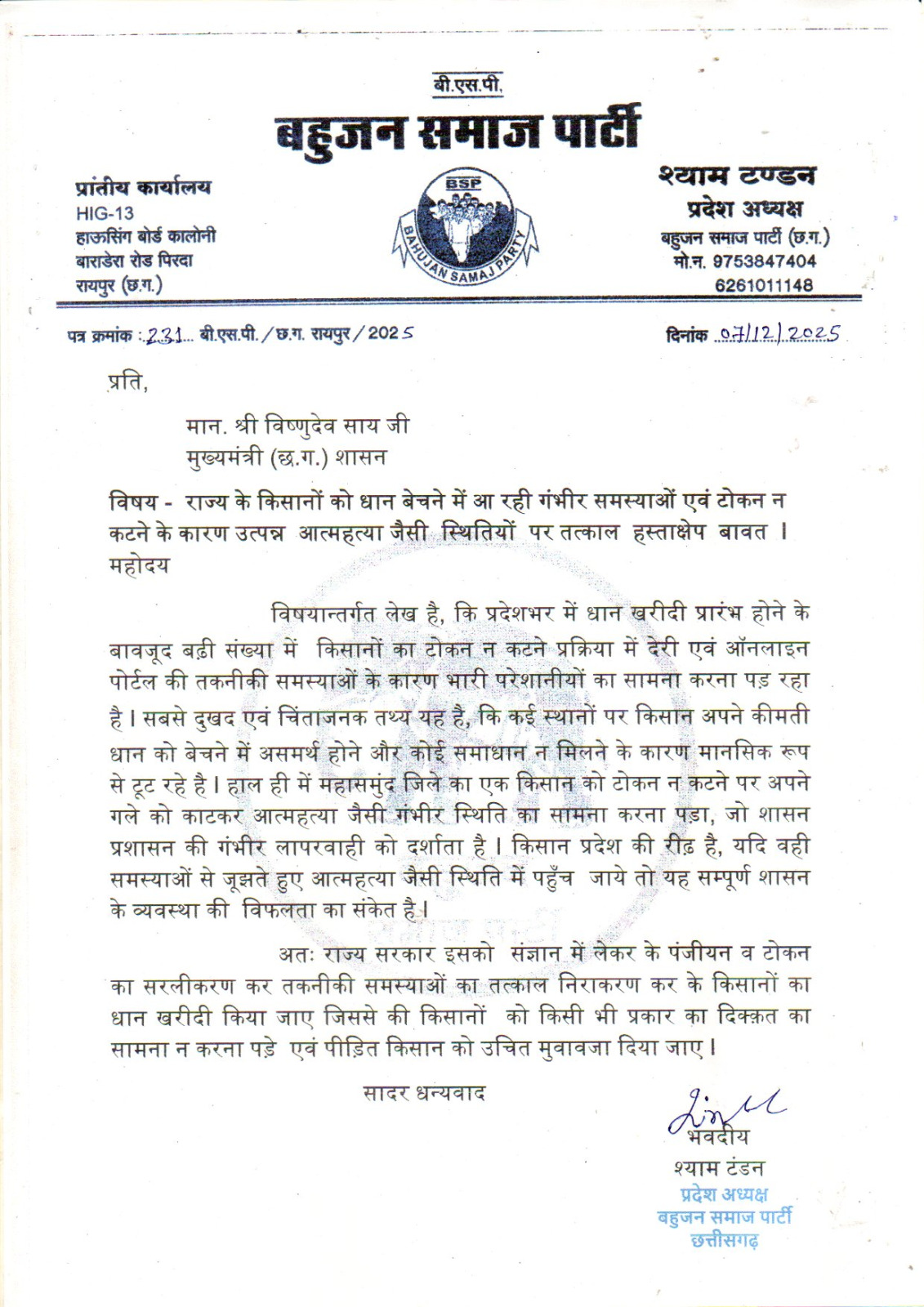 इसी गंभीर स्थिति को लेकर बहुजन समाज पार्टी छत्तीसगढ़ के प्रदेश अध्यक्ष श्याम टंडन ने मुख्यमंत्री विष्णुदेव साय को पत्र लिखकर तत्काल हस्तक्षेप की मांग की है।
