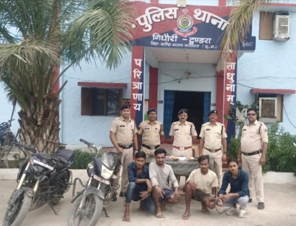 गिधौरी 18 मई 2025 – गिधौरी थाना पुलिस ने हाल ही में क्षेत्र में हुई तीन बड़ी चोरी की वारदातों का सफलतापूर्वक खुलासा करते हुए चार आरोपियों को गिरफ्तार किया है। यह कार्रवाई पुलिस अधीक्षक श्रीमती भावना गुप्ता के निर्देशन एवं थाना प्रभारी गिधौरी के नेतृत्व में गठित विशेष टीम द्वारा की गई।