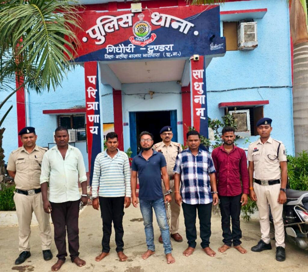 बलौदा बाजार पुलिस अधीक्षक श्रीमती भावना गुप्ता द्वारा घटना के संज्ञान में आते ही प्रार्थी के साथ गंभीर रूप से मारपीट करने वाले सभी आरोपियों की गिरफ्तारी हेतु थाना प्रभारी गिधौरी को आवश्यक दिशा निर्देश दिया गया। उक्त निर्देशों के परिपालन में थाना गिधौरी पुलिस द्वारा त्वरित कार्यवाही करते हुए प्रकरण में शामिल 05 आरोपियों को हिरासत में लिया गया है, जिनसे पूछताछ करने पर आरोपियों द्वारा पूर्व रंजिश की बात को लेकर प्रार्थी को ग्राम खपरीडीह के गुड़ी चौक में बांधकर बेल्ट, डंडा, राड आदि से मारपीट करते हुए उसे गंभीर चोंट पहुंचाना स्वीकार किया गया। कि प्रकरण में शामिल सभी पांच आरोपियों को आज दिनांक 16.06.2025 को विधिवत गिरफ्तार कर माननीय न्यायालय के समक्ष प्रस्तुत करने की प्रक्रिया की जा रही है। प्रकरण में शामिल एक आरोपी फरार है, जिसकी सरगर्मी से पता तलाश की जा रही है।