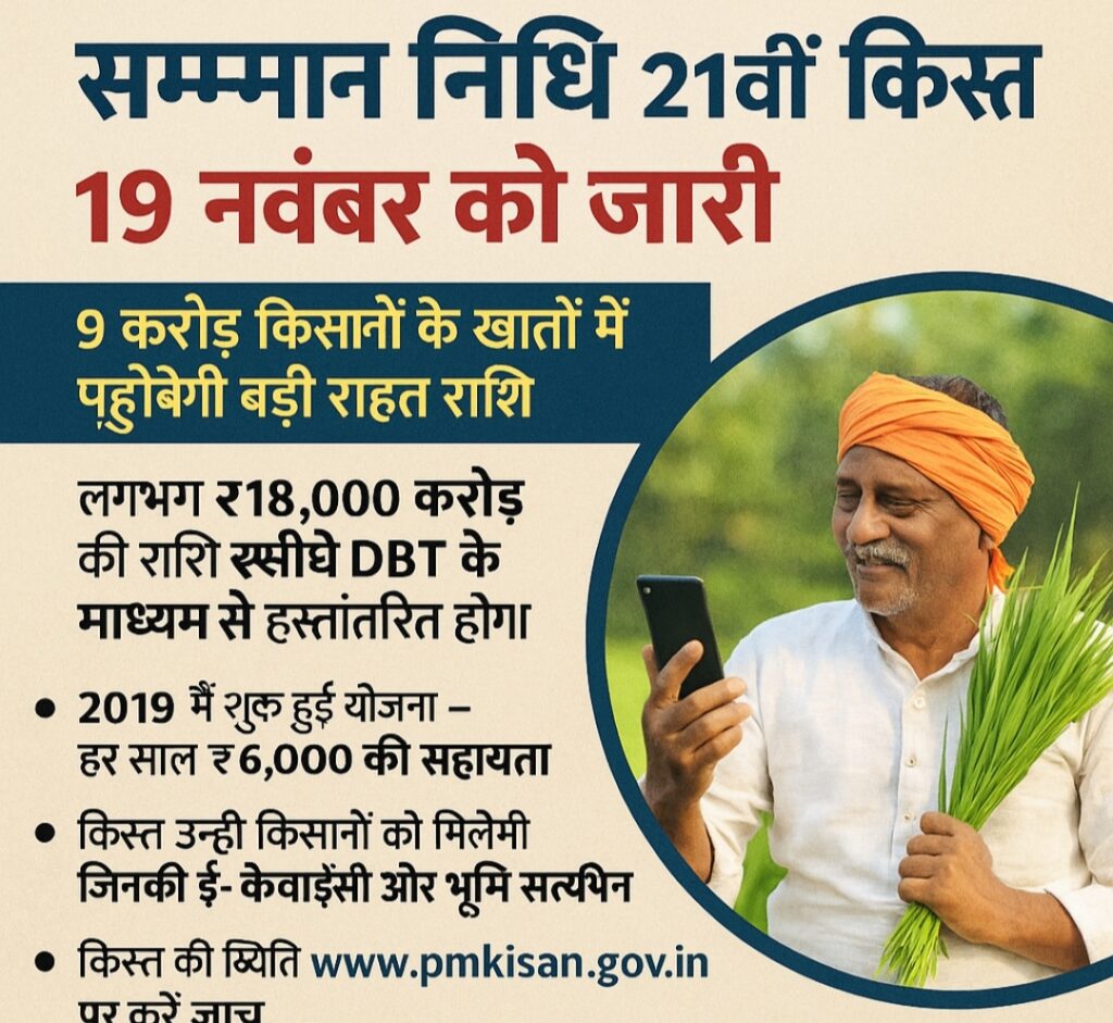 देश के करोड़ों किसानों के लिए एक बड़ी खुशखबरी सामने आई है। भारत सरकार की महत्वाकांक्षी योजना प्रधानमंत्री किसान सम्मान निधि (PM-KISAN) की 21वीं किस्त आगामी 19 नवंबर 2025 को जारी की जाएगी। इस किस्त के तहत लगभग 9 करोड़ किसानों को ₹2,000 प्रति किसान की राशि उनके बैंक खातों में सीधे DBT माध्यम से हस्तांतरित की जाएगी।