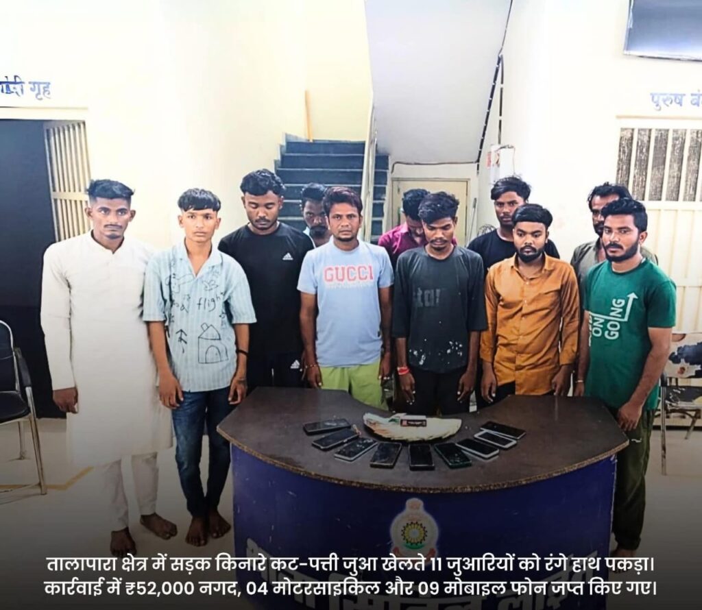 बिलासपुर। बिलासपुर पुलिस ने तालापारा क्षेत्र में जुआंड़ियों पर बड़ी कार्रवाई करते हुए 11 आरोपियों को धर-दबोचा है। यह सभी आरोपी सड़क किनारे कट-पत्ती जुआ खेल रहे थे। पुलिस ने मौके से ₹52,000 नगद, 04 मोटरसाइकिल और 09 मोबाइल फोन बरामद किए हैं। कार्रवाई के बाद क्षेत्र में हड़कंप मच गया और स्थानीय लोगों ने पुलिस की तत्परता की सराहना की।