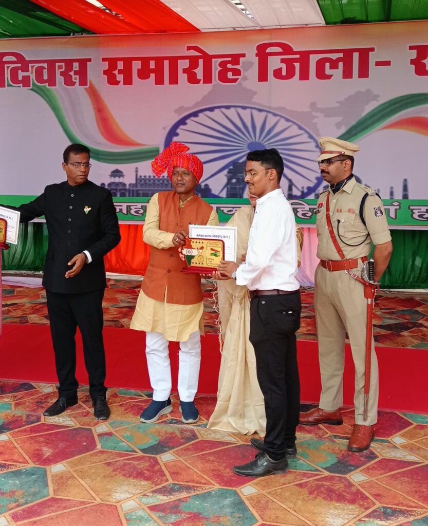 स्वतंत्रता दिवस के पावन अवसर पर आयोजित उत्कृष्ठ कार्यशैली अवार्ड/सम्मान समारोह में हमारे सम्माननीय ई-डिस्ट्रिक्ट मैनेजर श्री गंगाधर विश्वकर्मा सर को सम्मानित किया जाना हम सभी के लिए गर्व और हर्ष का विषय है। आपकी उत्कृष्ट नेतृत्व क्षमता, सेवा भावना और समर्पित कार्यशैली ने न केवल विभाग बल्कि पूरे ई-डिस्ट्रिक्ट परिवार का मान-सम्मान बढ़ाया है। आपके मार्गदर्शन में हम सभी ने नई ऊंचाइयों को छुआ है और समाज के विकास में योगदान देने का अवसर प्राप्त किया है। यह सम्मान आपके निरंतर परिश्रम, ईमानदारी और कार्य के प्रति प्रतिबद्धता का प्रतीक है। हम सभी ई-डिस्ट्रिक्ट परिवार की ओर से आपको हृदय से बधाई एवं शुभकामनाएं देते हैं कि आप इसी प्रकार नई सफलताओं के शिखर पर पहुंचते रहें और हम सभी को प्रेरणा देते रहें। साथ ही, आप सभी को स्वतंत्रता दिवस की हार्दिक शुभकामनाएं।