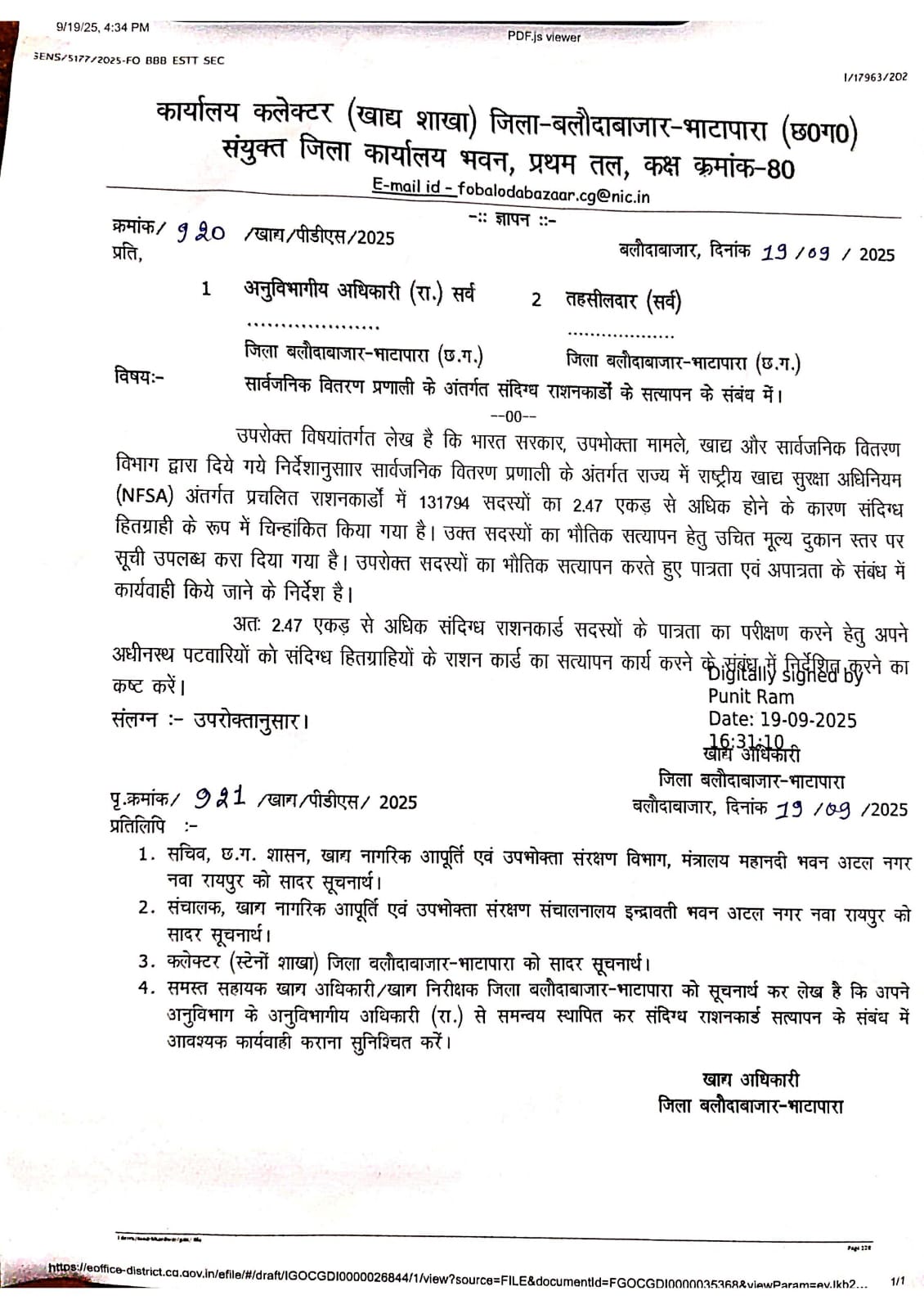राशन कार्डों की संदिग्ध सूची जारी की गई है। प्रशासन ने स्पष्ट किया है कि जिन लोगों का नाम इस संदिग्ध सूची में शामिल है, उन्हें अनिवार्य रूप से अपनी जमीन का सत्यापन कराना होगा। इसके लिए संबंधित पटवारी से जमीन का सत्यापन प्रमाण पत्र प्राप्त करना होगा।