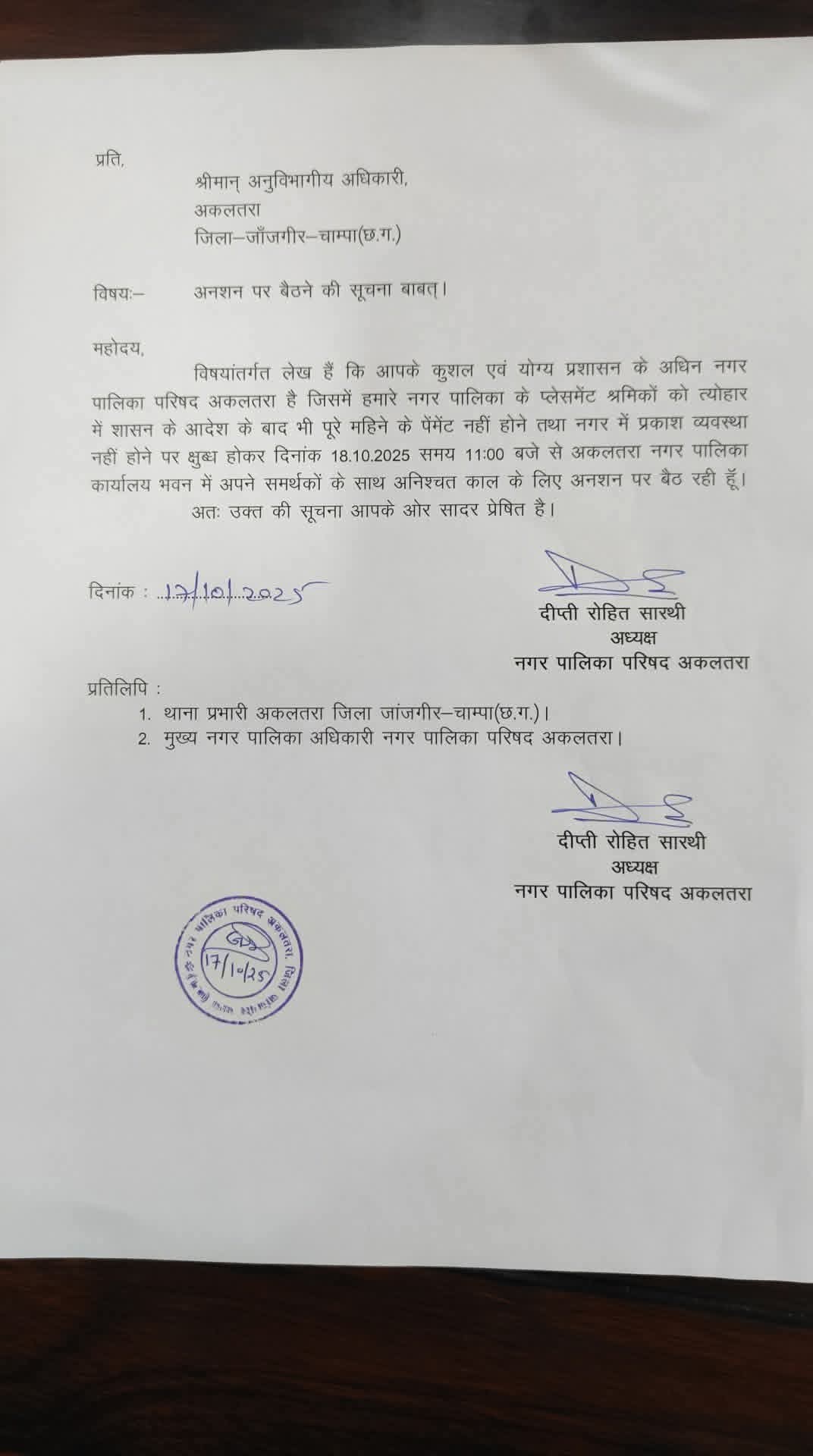 अकलतरा नगर पालिका में कार्यरत प्लेसमेंट कर्मचारियों ने कई बार वेतन के लिए गुहार लगाई थी, लेकिन समाधान नहीं हुआ। अध्यक्ष की पहल और उनके दृढ़ संकल्प से अब सभी कर्मचारियों को आर्थिक राहत मिली है।