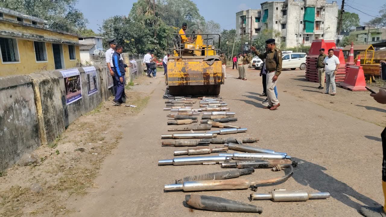 यातायात नियमों के कड़ाई से पालन करवाने तथा सड़क सुरक्षा को मजबूत करने की दिशा में रायगढ़ पुलिस ने एक बड़ा कदम उठाते हुए लगभग 200 मॉडिफाई साइलेंसर को आज रोड रोलर से नष्ट कर दिया। यह कार्रवाई पुलिस अधीक्षक श्री दिव्यांग पटेल के निर्देशन में की गई।