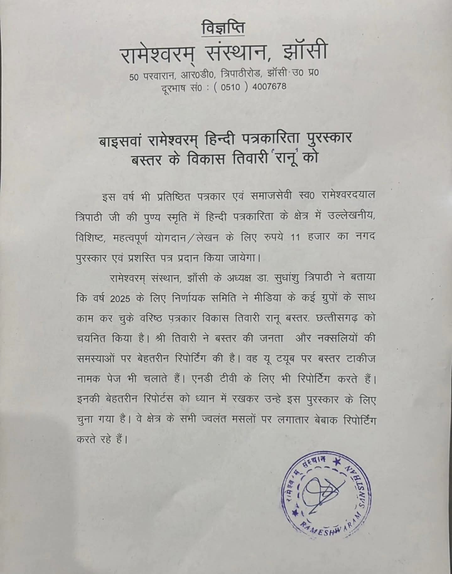 हिन्दी पत्रकारिता के क्षेत्र में उल्लेखनीय, निर्भीक और जनसरोकारों से जुड़ी रिपोर्टिंग के लिए बस्तर के वरिष्ठ जमीनी पत्रकार विकास तिवारी ‘रानू’ को वर्ष 2025 का 22वां रामेश्वरम् हिन्दी पत्रकारिता राष्ट्रीय पुरस्कार प्रदान किया जाएगा। यह सम्मान प्रतिष्ठित पत्रकार एवं समाजसेवी स्वर्गीय रामेश्वरदयाल त्रिपाठी की पुण्य स्मृति में दिया जाता है।