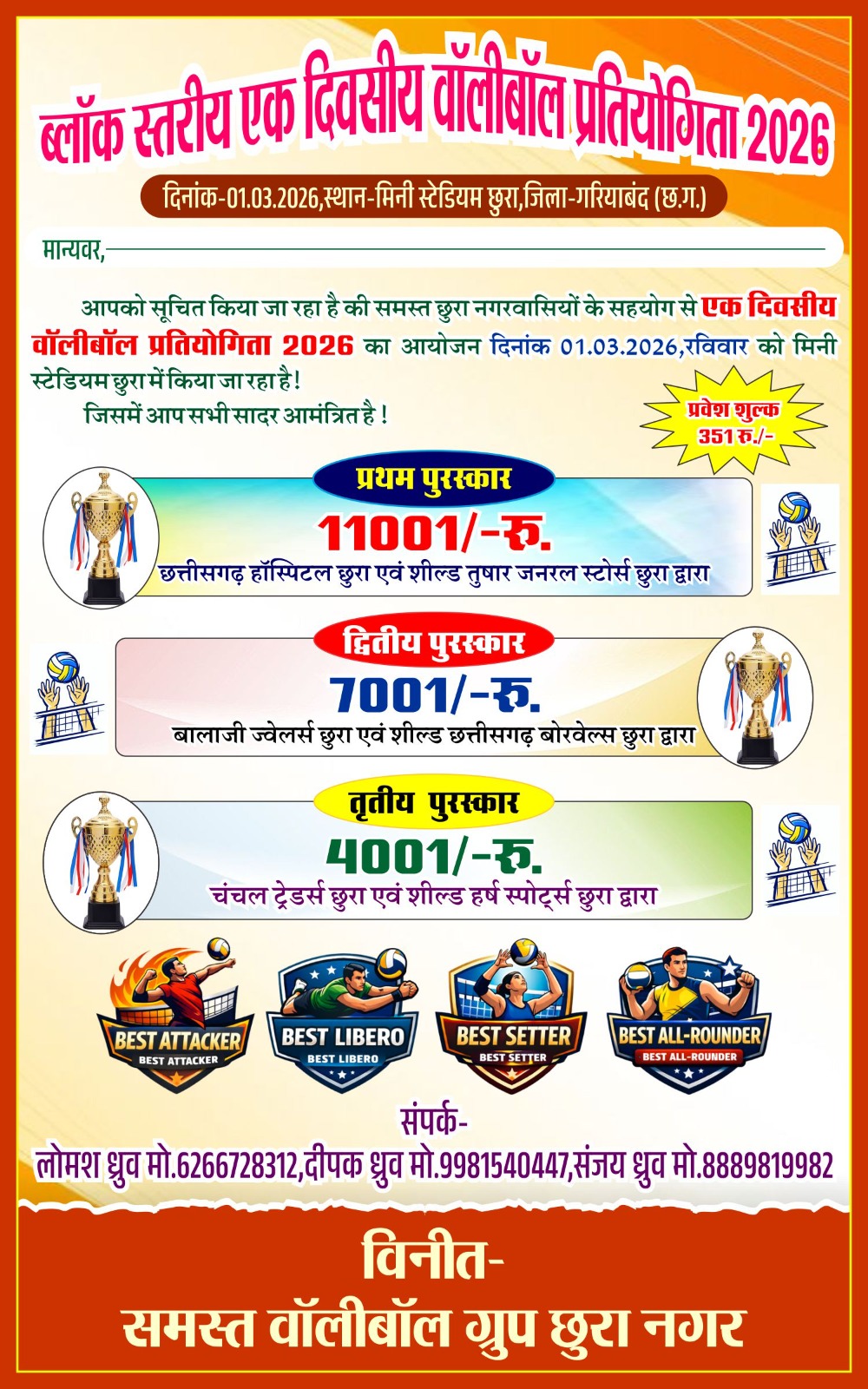 छुरा/ गरियाबंद – खेल प्रतिभाओं को मंच देने और युवाओं में खेल भावना को प्रोत्साहित करने के उद्देश्य से 01/03/2026 दिन रविवार को छुरा के मिनी स्टेडियम में ब्लॉक स्तरीय एक दिवसीय बालीबाल प्रतियोगिता का भव्य आयोजन किया जा रहा है। प्रतियोगिता को लेकर खिलाड़ियों और खेल प्रेमियों में जबरदस्त उत्साह देखा जा रहा है।
