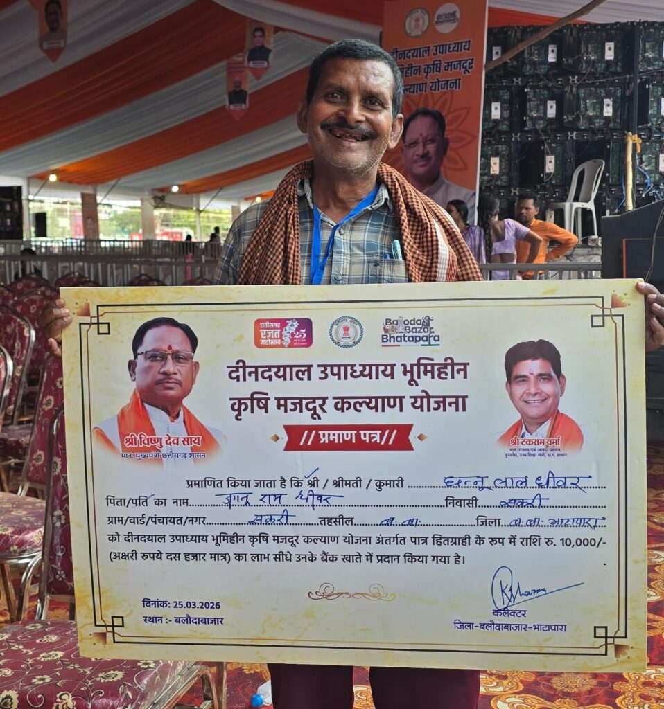 बलौदाबाजार | 28 मार्च 2026 प्रदेश सरकार की जनकल्याणकारी योजनाओं ने समाज के अंतिम व्यक्ति तक खुशहाली पहुँचाना शुरू कर दिया है। बलौदाबाजार जिले के ग्राम सकरी के रहने वाले छन्नू लाल धीवर के लिए ‘दीनदयाल उपाध्याय भूमिहीन कृषि मजदूर कल्याण योजना’ एक नई उम्मीद की किरण बनकर आई है।