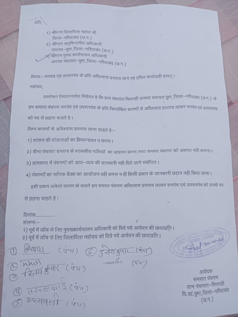 छुरा /गरियाबंद:- जनपद पंचायत छुरा अंतर्गत ग्राम पंचायत पिपराही इन दिनों गंभीर विवादों के केंद्र में है। पंचायत के सरपंच और उपसरपंच के खिलाफ पंचों का असंतोष अब खुलकर सामने आ गया है। पंचायत के पंचगणों ने संयुक्त रूप से दोनों जनप्रतिनिधियों के विरुद्ध अविश्वास प्रस्ताव लाने का निर्णय लिया है और इस संबंध में प्रशासन को लिखित आवेदन सौंपकर त्वरित कार्रवाई की मांग की है।