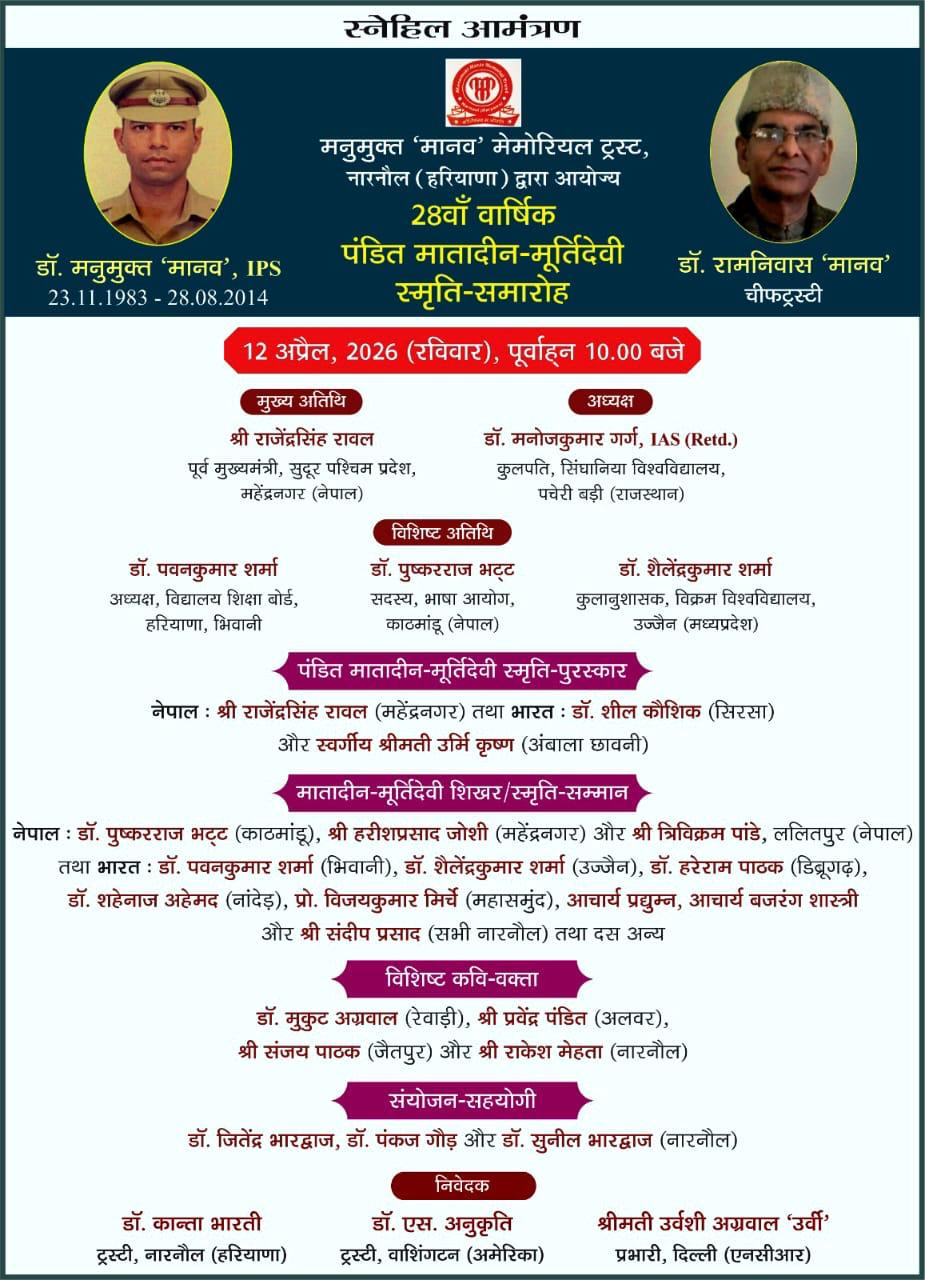 कार्यक्रम के दौरान कवियों और वक्ताओं की प्रस्तुतियों ने समा बांध दिया। ट्रस्ट के मुख्य ट्रस्टी डॉ. रामनिवास ‘मानव’ और डॉ. कान्ता भारती ने अतिथियों का आभार व्यक्त किया, जबकि संचालन डॉ. जितेंद्र भारद्वाज, डॉ. पंकज गौड़ और डॉ. सुनील भारद्वाज ने किया।
