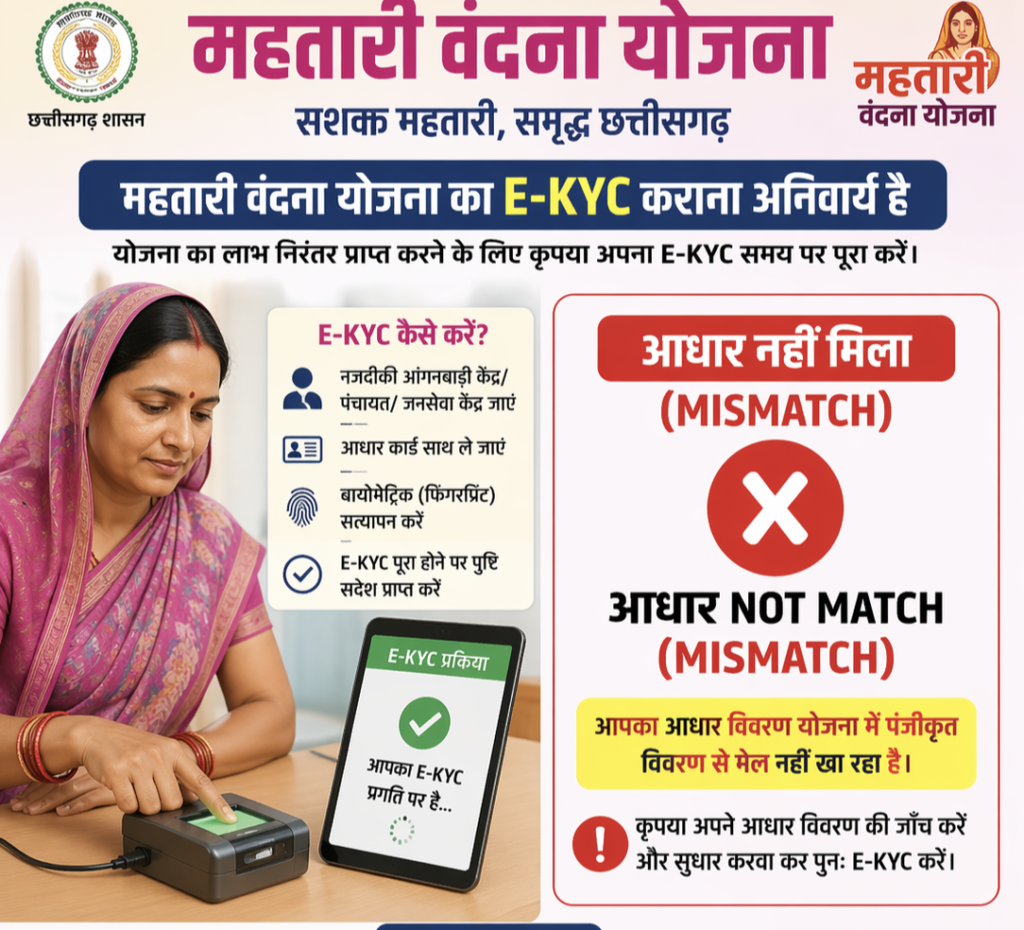 बलौदाबाजार/सोनाखान :छत्तीसगढ़ शासन की महत्वाकांक्षी ‘महतारी वंदना योजना’ के तहत वर्तमान में भाजपा सरकार द्वारा लाभार्थियों का e-KYC अनिवार्य रूप से करवाया जा रहा है। लेकिन इस प्रक्रिया ने प्रदेश की हजारों महिलाओं की नींद उड़ा दी है। योजना का लाभ निरंतर प्राप्त करने के लिए जारी इस प्रक्रिया में ‘आधार मिसमैच’ (Aadhaar Mismatch) की समस्या एक बड़ी बाधा बनकर उभरी है, जिससे महिलाओं में भारी आक्रोश और चिंता का माहौल है।