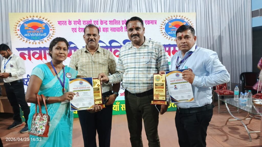 25 अप्रैल 2026। नवाचारी गतिविधियां समूह भारत (छत्तीसगढ़) द्वारा आयोजित *राष्ट्रीय नवाचारी शिक्षा रत्न सम्मान सह शैक्षणिक संप्रवाह सत्र 2025-26* में पलारी ब्लॉक के शिक्षक लोचन बांधे एवं दुर्गा साहू को उनके शैक्षणिक नवाचारों के लिए सम्मानित किया गया। कार्यक्रम का आयोजन स्वामी आत्मानंद प्रो. जे.एन. पाण्डेय शासकीय उत्कृष्ट हिंदी माध्यम उच्च माध्यमिक विद्यालय, रायपुर में किया गया।